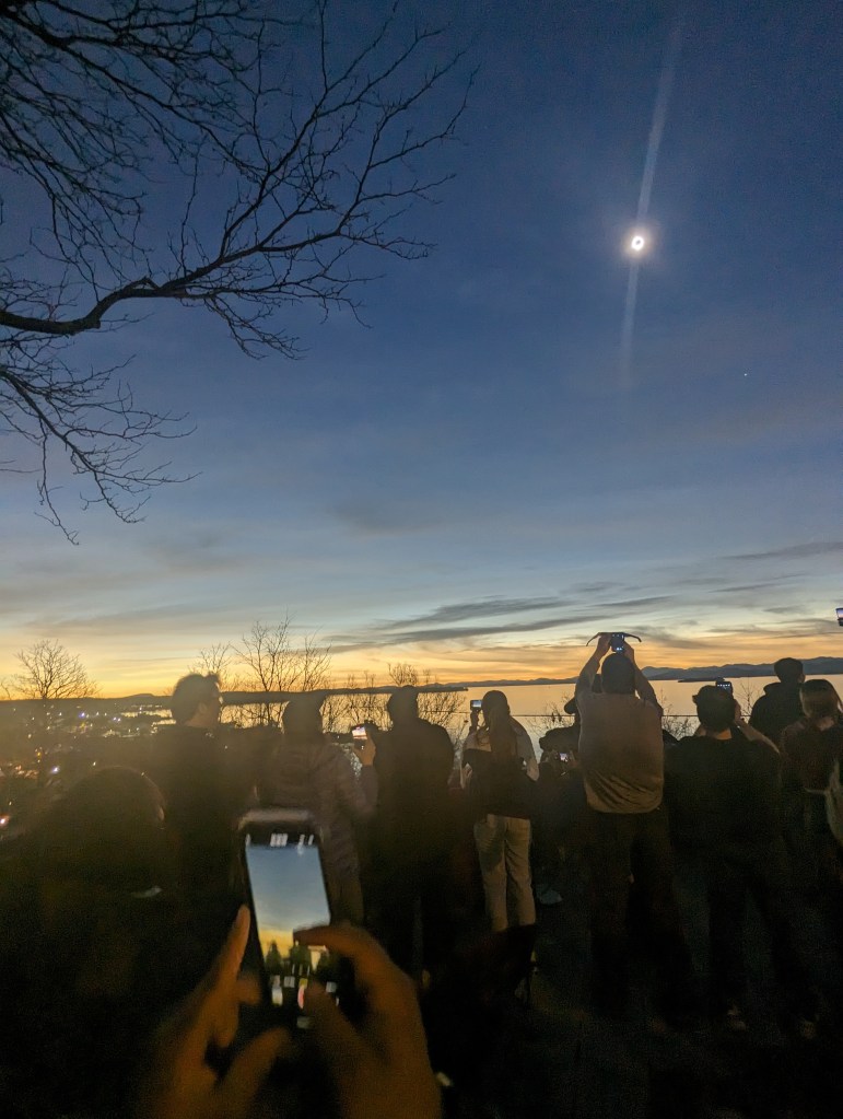 The next day was a day full of anticipation. It was time to travel to Burlington the largest city in VT that was going to see the Eclipse. Going in, we knew parking was going to be pain and… it was not that bad. Burlington closed a highway down for parking and we took advantage. We then met up with more friends an proceeded to… empty my life savings at a reto videogame Bar. We took occasional peaks at the sun as the moon slowly working towards gobbling it up. Then as time grew near we traveled to battery park in Burlington and watched with the crowd as our shadows grow shaper and the day cooler and almost an instant the sun went dark and turned to a ring in the sky, I couldn’t look away as the suns was completely eclipsed by the moon. We were in the dark ness, every direction was daytime. we were in the moons shadow. It wasn’t long before the moon moved away and sunlight spilled around the moon looked like a Dimond ring and like that the sun was there again. For the rest of the hour the sun regains its strength as the moon backs away.