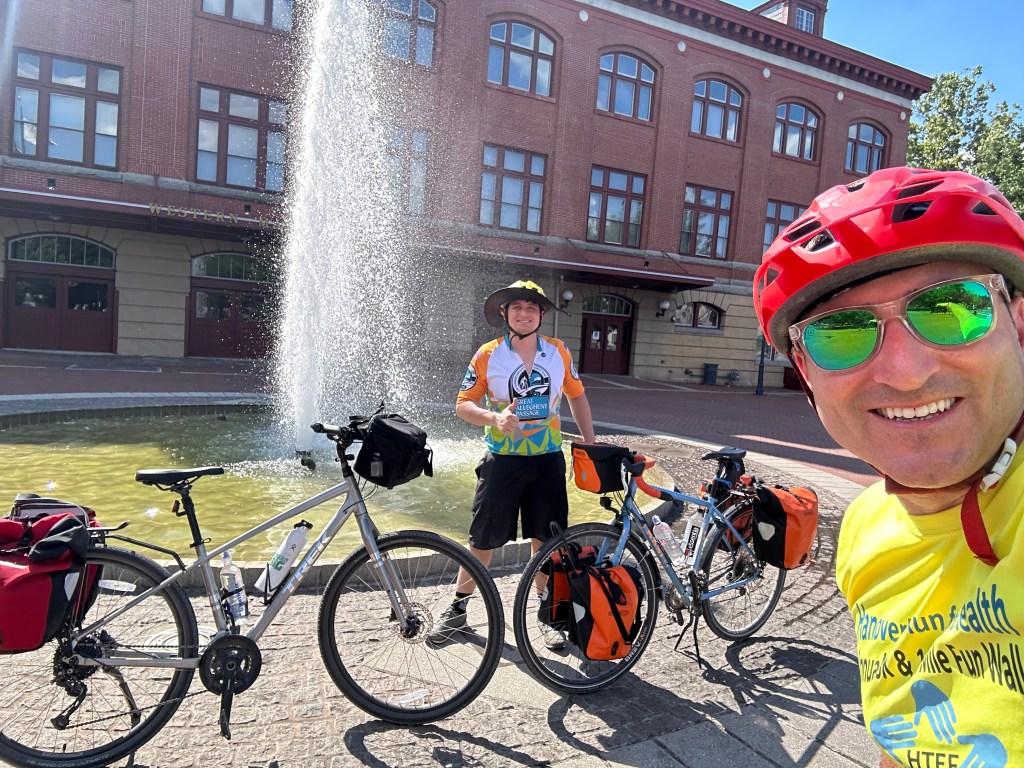 As we approached the town of Confluence, we were greeted by the town crier—a high school student handing out coupons for a free postcard or patch kit at the local bike shop. This was the town where three rivers converge, and we crossed the loudest bridge into Confluence. The boards beneath us creaked and bounced, each step producing a symphony of squeaks and slaps as we rode our two-wheelers across. With 50 to 60 boards to navigate, it was a chaotic cacophony of sounds.