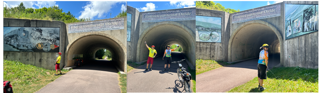 The trip had the normal views then the forest started to open up then some more and eventually to the Salisbury viaduct which puts us over a hundred feet in the air over some of the most beautiful Pennsylvania landscape, with trains and highways and rivers. And we saw a guy on ye old bike (a penny farthing). We continued on eventually hitting Meyersdale and many other bridges like the keystone viaduct and eventually an Amish shopping stand where we resupplied on cherries with the pits, cucumbers and I bought Boo a gift. We kept pretty entertained spitting the cherries pits at trail signs and other landmarks while moving. Eventually we make it the longest down hill on the trek marked by the Eastern continental divide. You see if a drop of water landed on the western half of this tunnel it will flow to the gulf of Mexico.