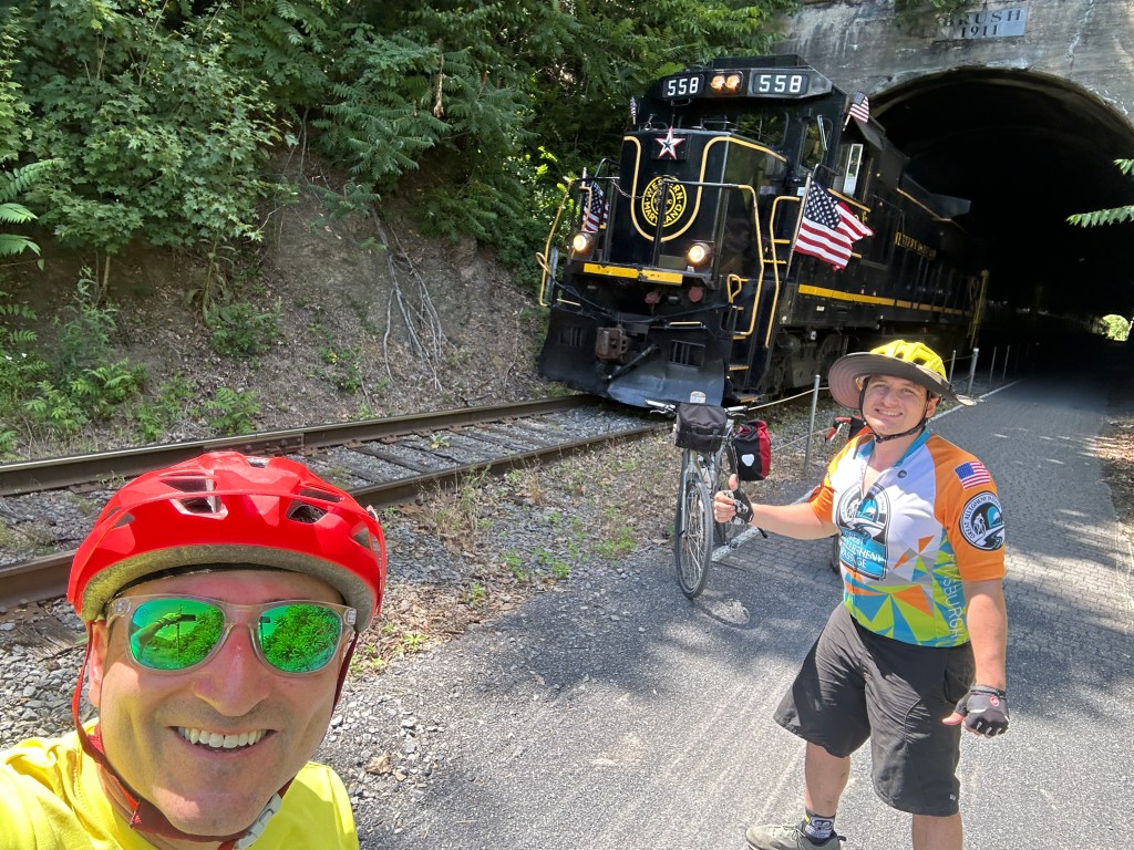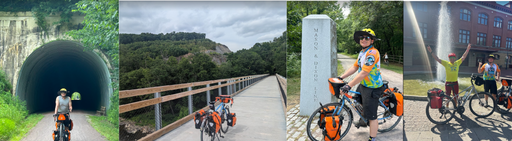 The journey from Connellsville to Rockwood proved to be quite an adventure. We traversed several massive bridges, supported by hefty concrete pillars and steel trusses, once built for trains but now serve as a bike path as the lines became unprofitable. Each bridge was accompanied by a long tunnel, leading us through dense forests toward a charming town that capitalizes on its water resources through white-water rafting and bike rentals. The local bike economy was thriving, and we pressed on to avoid any delays. Much of our ride took place among the Pennsylvania mountains, with glimpses of beautiful rivers carving their way through the Appalachian landscape.