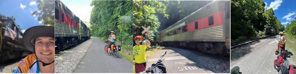 In that moment, we realized we had miscalculated. We quickly staged a selfie, but then noticed the train was moving quite slowly. We took turns snapping pictures while riding our bikes, a balancing act of holding the phone in one hand while steering with the other. I’d never fallen doing this, though I had dropped my phone… more than once.